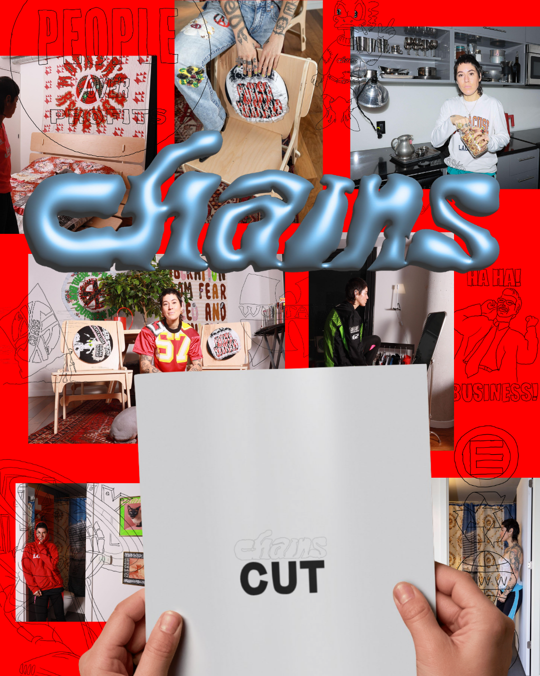In summer 2023, Chains began Chains Cut as a sustained studio practice exploring sustainable domestic craft within the conditions of frequent relocation and rental living. Collaborating with Erik LeBrun of Agile Fabrication (Haute-Aboujagane, New Brunswick), the work developed a modular home decor and furniture system crafted from repurposed garments, deadstock fabric, and found materials.